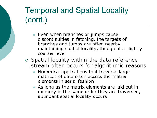 A time and a place for everything. Spatial locality the concept that likelihood of referencing a resource is higher if a resource near it was just referenced. This principle takes into consideration two aspects.